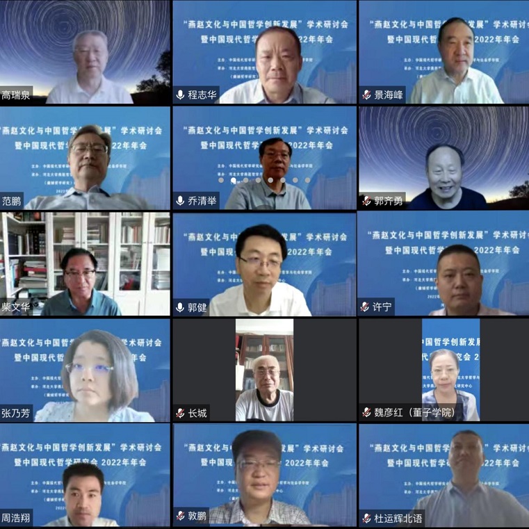 8月13-14日,由中国现代哲学研究会和我院联合主办,我院燕赵哲学与文化研究中心、《畿辅哲学研究》编辑部承办的“燕赵文化与中国哲学创新发展”学术研讨会暨中国现代哲学研究会2022年年会如期举行。来自中央党校、清华大学、武汉大学、中山大学、深圳大学、山东大学、华东师范大学、河北师范大学、衡水学院等省内外40多所高校和科研机构的80多名专家学者参加会议,我院全体在读博士生、博士后和中国哲学、外国哲学、伦理学专业的硕士生参与聆听了会议。会议开幕式由我院院长程志华教授主持。因疫情防控需要,会议全程为线上形式召开。