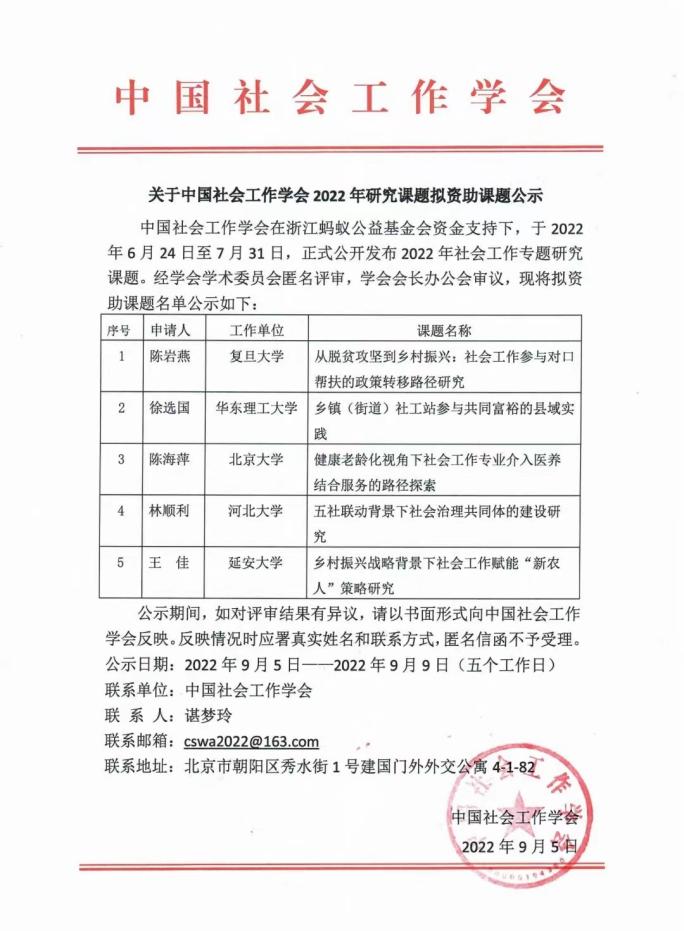 近日,中国社会工作学会正式公布2022年度资助课题,我院林顺利教授申报的“五社联动背景下社会治理共同体的建设研究”成功获批,本次课题征集工作于6月启动,面向全国高校科研院所和社会团体,经个人申报、资格审查、匿名评审、办公会审议等程序环节,最终评出5项研究课题准予立项,承担单位分别为复旦大学、华东理工大学、北京大学、河北大学和延安大学。