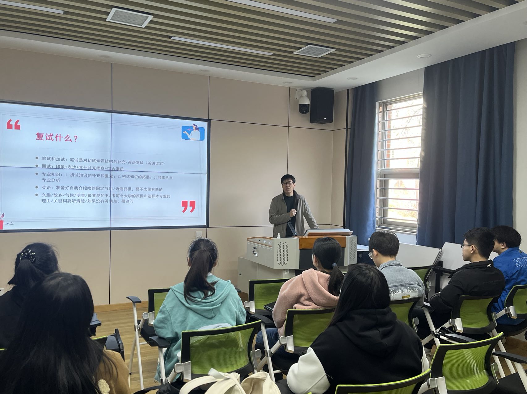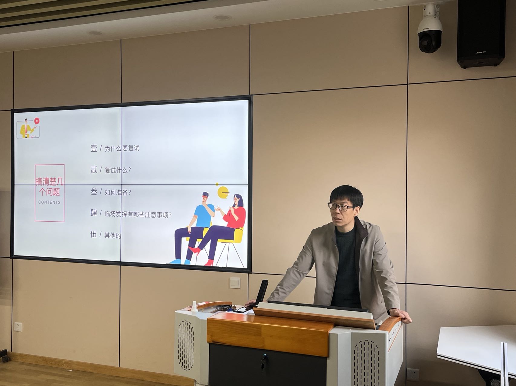林老师首先对同学们取得的初试成绩表示祝贺,鼓励同学们稳住步伐,打好考研复试信息战、心理战、冲刺战。就同学们关心的复试问题,林老师从复试形式、遴选标准、专业知识准备、复试礼仪、面试细节等方面进行了详细讲解,并提醒学生们“低头学习、抬头看路”,密切关注招生单位复试信息,有针对性地做好“场景预演式复习”。