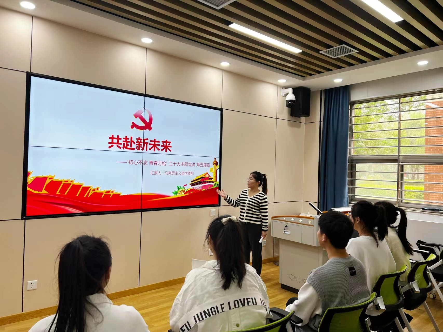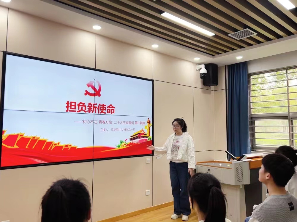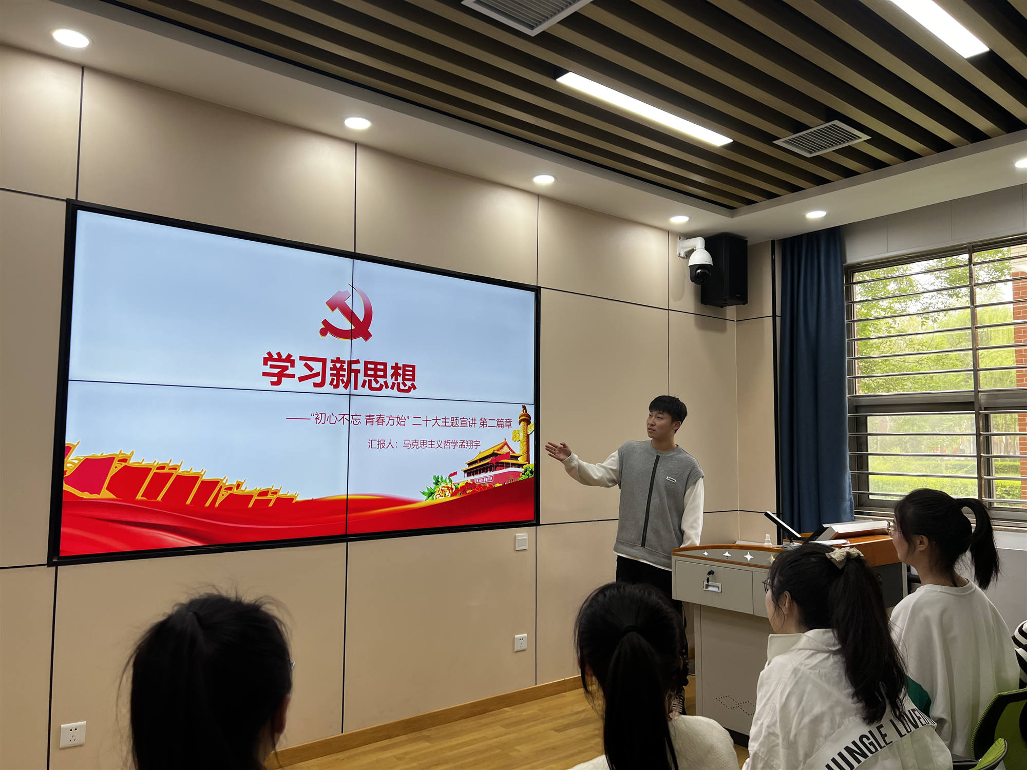 为深入学习贯彻二十大精神,4月16日下午,学院团委在B4-112专业实验室召开 “不忘初心 青春方始”为主题的二十大精神宣讲会。此次宣讲会由学院马克思主义哲学专业研究生团队六名同学担任主讲,学院党委书记张露红、团委书记王昭、辅导员尹清华,及学生代表50余人参加了本次活动。