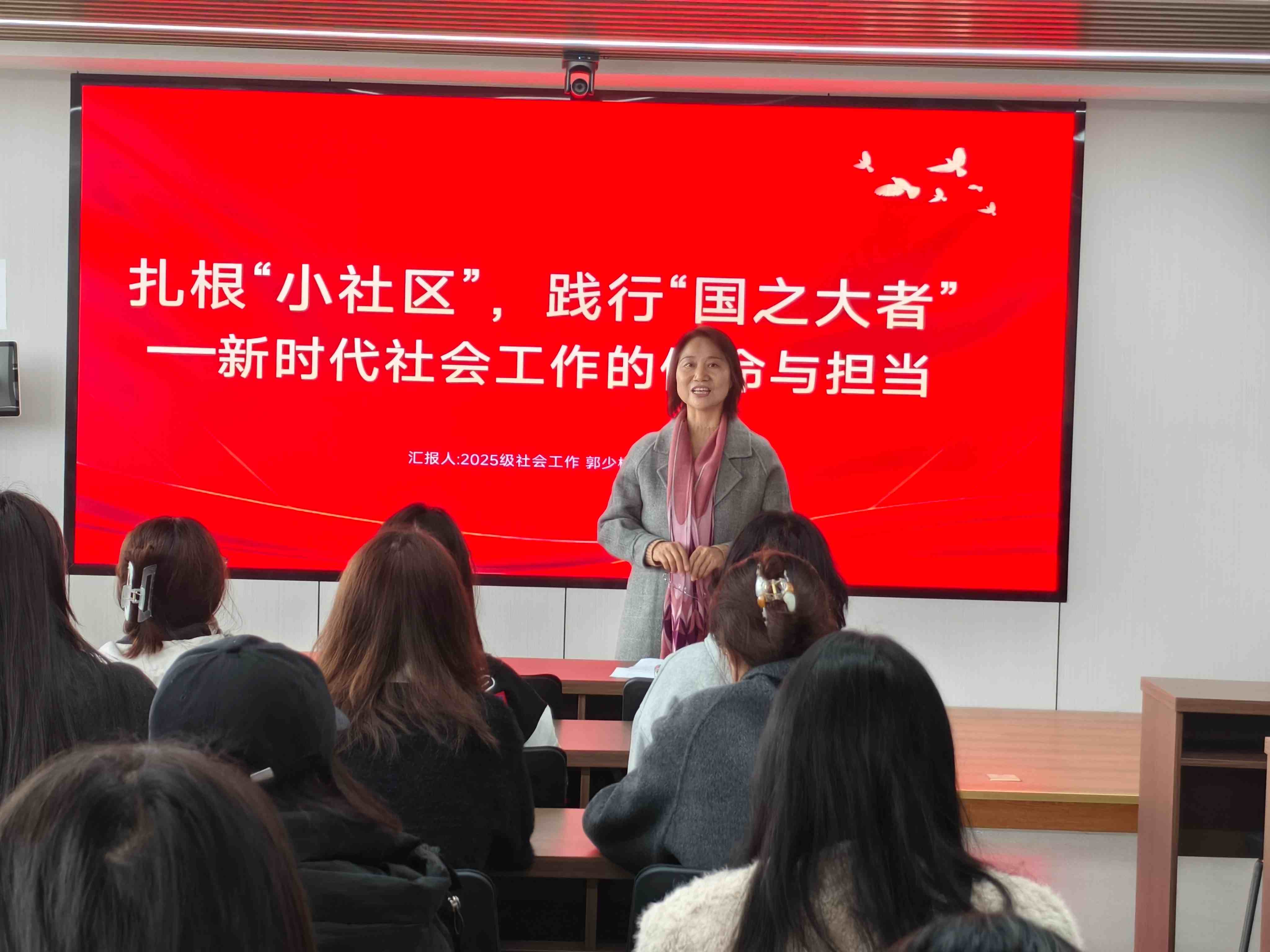 活动最后,党委书记张露红作总结讲话。她强调,社会工作在推进国家治理体系和治理能力现代化中具有不可替代的重要作用,是连接党和政府与人民群众的桥梁纽带。她希望同学们积极响应时代号召,将个人理想融入国家发展大局,扎根社区、服务基层,在实干中书写新时代社工学子的使命与担当。